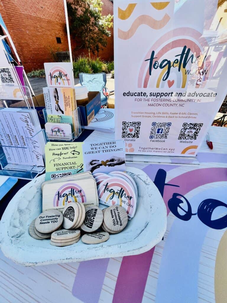 Our goals are to help the fostering community. That may mean coming alongside DSS to recruit more foster families or guardians ad litem [advocates]; it may mean picking up dinner for everyone involved in a foster care information and training class; and, it may mean standing at informational tables at churches in Macon County, town events, or local organizations to help the people of Macon County understand the needs of our foster community.