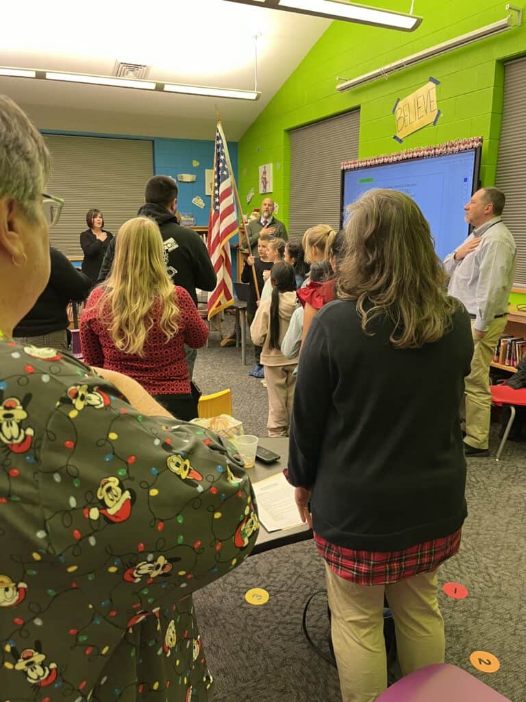 As a part of the meeting’s presentations segment, East Franklin’s counselor Adrianna Bates’ fourth grade leadership team, Ambassadors, sang two Christmas songs, accompanied on the guitar by Summer Brook Morgan [of the professional musical group Summer & Bray], who is an interim music teacher at East Franklin. The team also presented an award for the Best Cookie Decorating Contest among the board members.