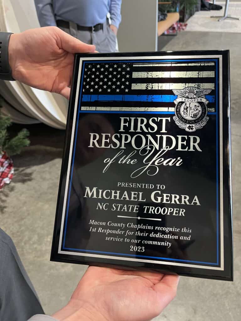No matter what time of the day or night, volunteer chaplains in Macon County work alongside first responders to provide prayer, comfort, debriefing and more. Recently, three current Macon County chaplains, Revs. Bonnie Peggs, Davis Hooper, and Danny Antoine, individually came to a consensus that N.C. State Trooper Michael Gerra should receive the “First Responder of the Year” award.