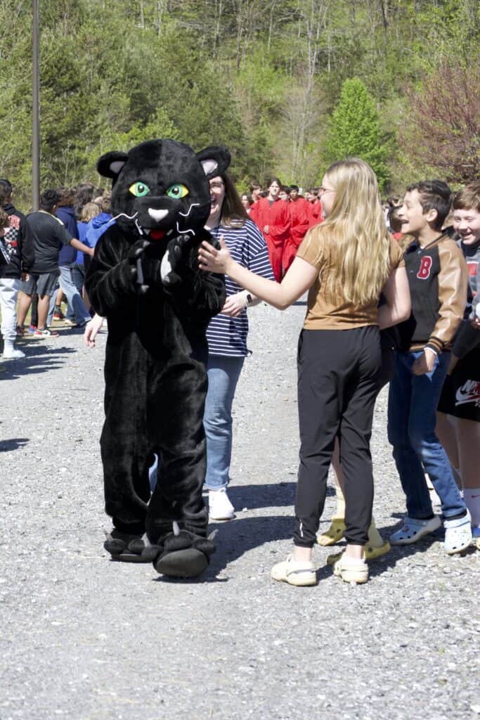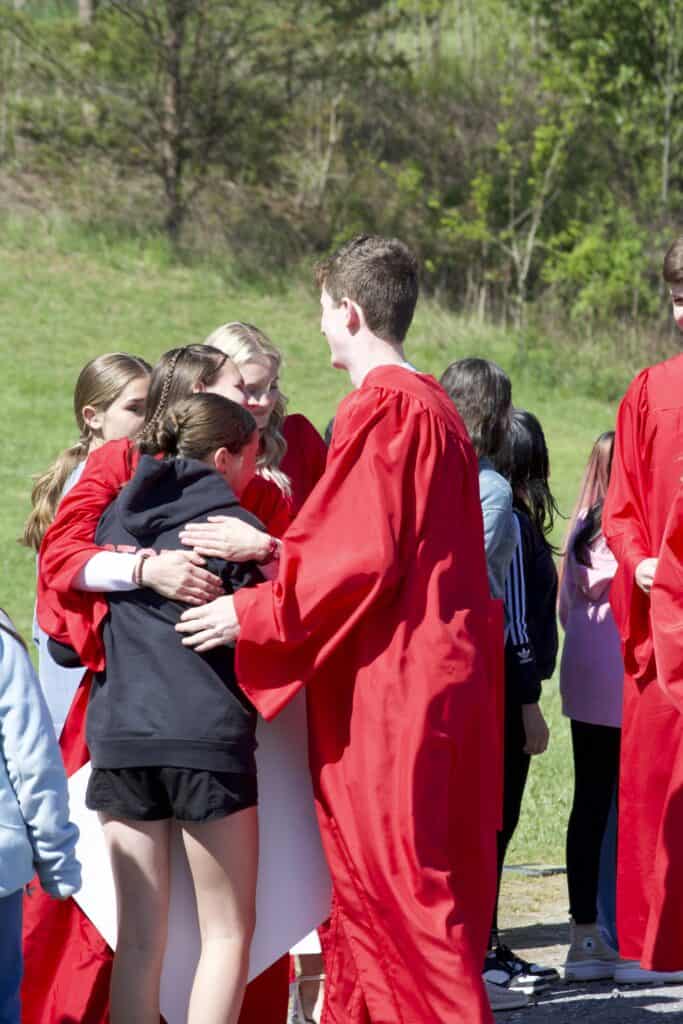 Waiting to hug the oldest of his four daughters was Penny Moffitt’s husband, Justin Moffitt, a teacher of computer applications at MVI. “I told my students before we came outside to greet the seniors that we are cheering them on because they have worked hard,” said Justin. “These [Mountain View] students will be there in a few short years and they will want to be cheered on as well.”