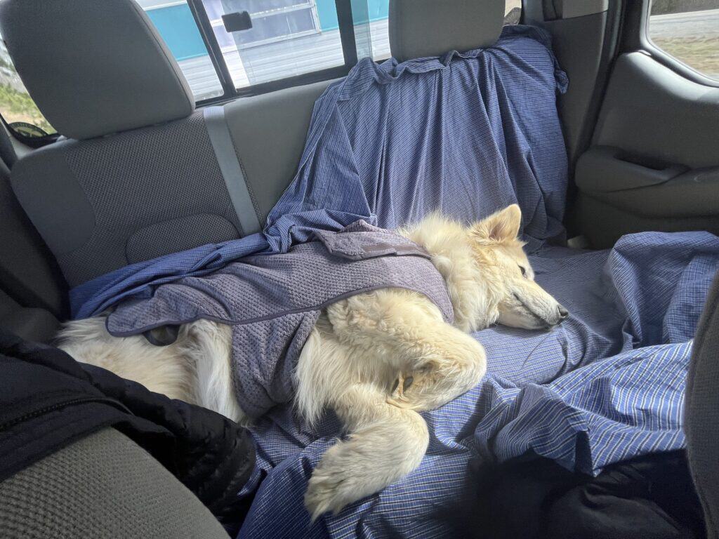A Pyrenees-husky mix who celebrates her fourth birthday April 27 (the day before mine, ironically), her 85-90-pound, miniature-horse size belies her demeanor. She is a gentle giant in every sense of the phrase. Thus, we are able to travel with her without worrying about her bowling someone over everywhere we stop.