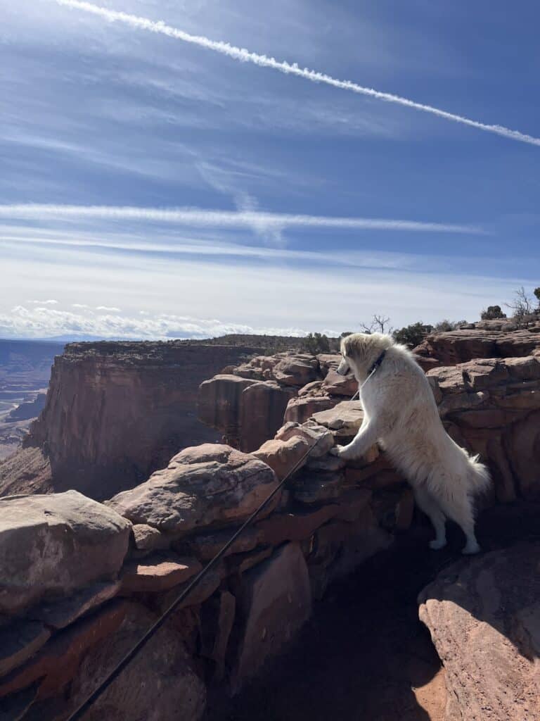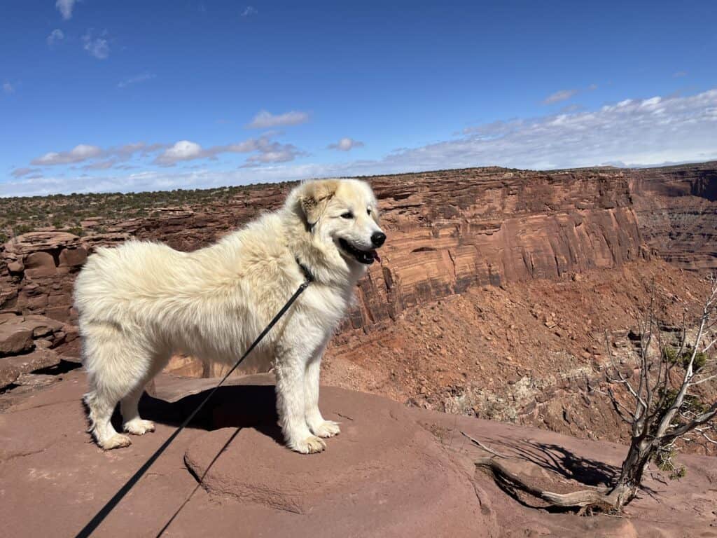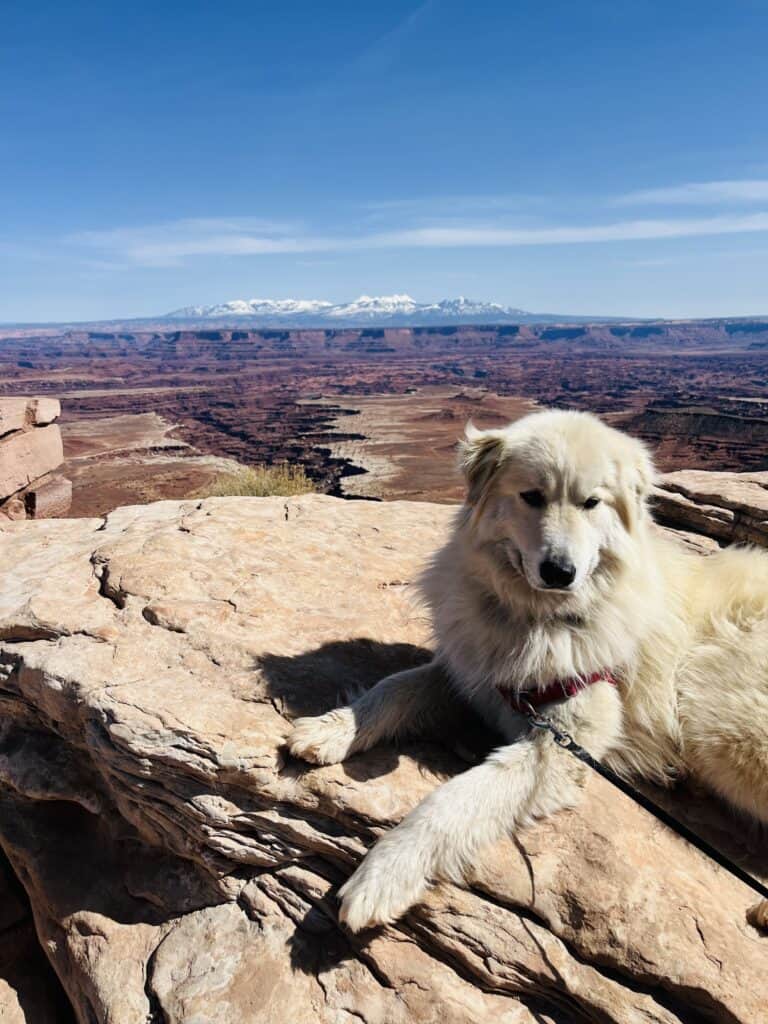 Dead Horse Point State Park near Moab, Utah, (between Arches and Canyonlands National Parks), hired us and conveyed that it was very dog accommodating. So, Feb. 29, we loaded up our large and extremely furry white dog into the back seats – yes, she takes up the entire space – and hooked up our 1969, 14-foot, vintage Shasta camper (with wings) and began our four-day drive to Utah.