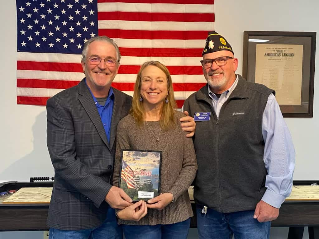 MACON SENSE was honored by American Legion Post 108 Commander Jack Castle (right) in Franklin for its coverage of Veteran-related topics, programs, and organizations in Macon County. Accepting the plaque was Dan Finnerty and Deena C. Bouknight.