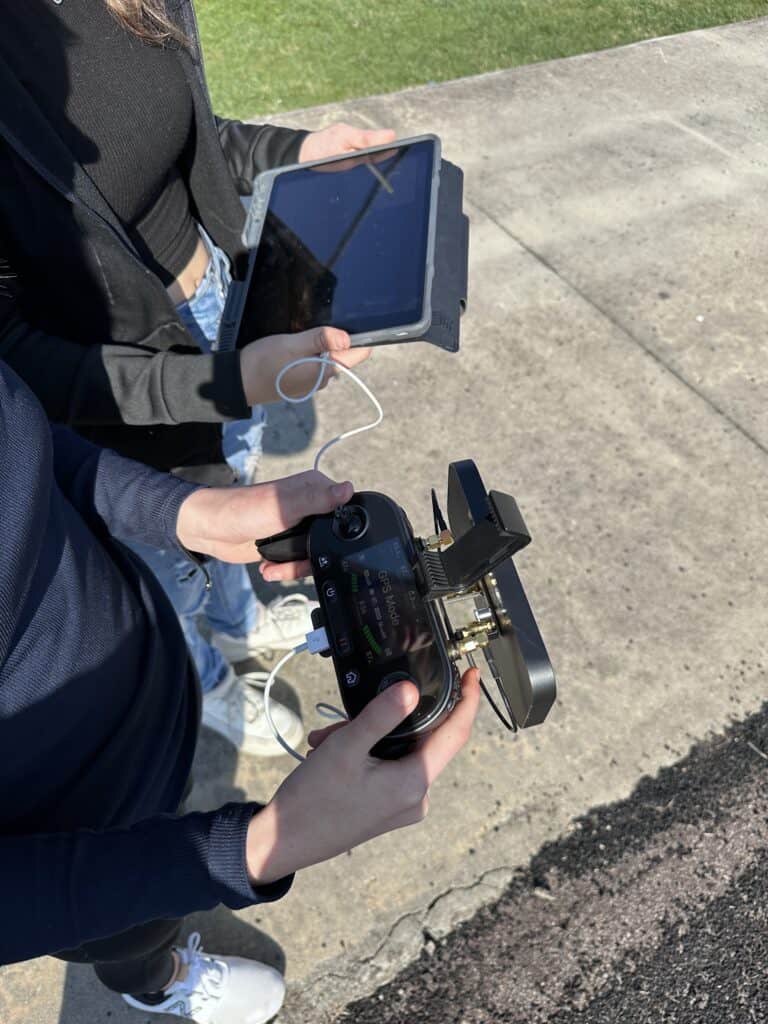 Students Rylee Rogers and Divine Wilkinson (Bryan’s daughter) can co-pilot the class’s most advanced drone, aptly called “The Big Drone.” Rylee explained that it only took two days to learn to fly the complex and expensive drone. She also said that her favorite part of flying was “scoping the surrounding scenery.”