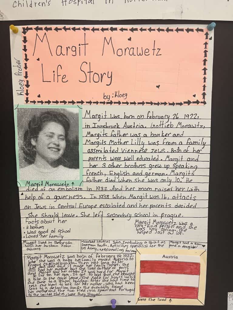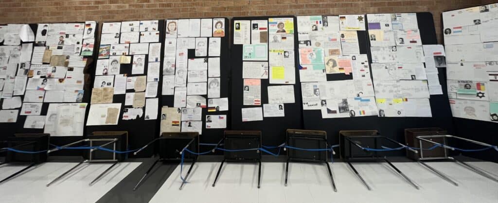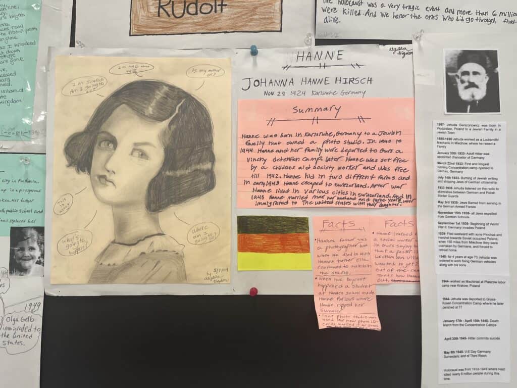 The Holocaust Remembrance Wall project involves 7th graders researching a specific person of Jewish descent who lived through or succumbed to the Holocaust. Students must present to teachers and students a written and visual representation of that individual’s life and then hang the project on the wall.
