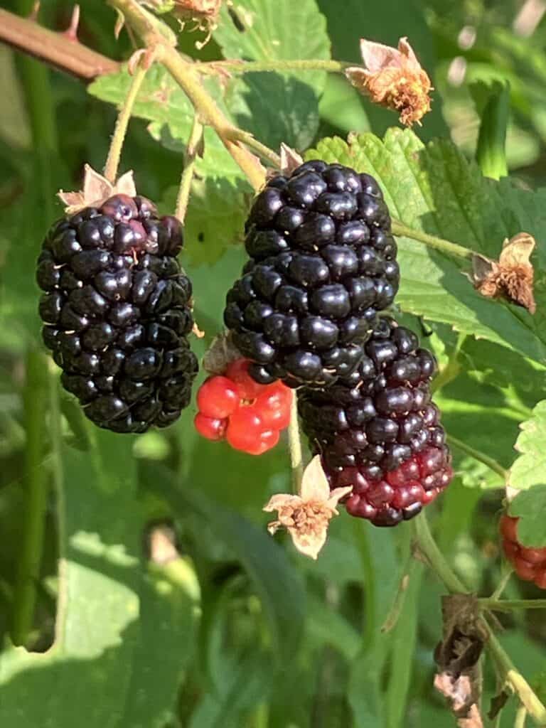It’s blackberry picking time, if you are so inclined. You must be willing to brave the heat, humidity, briar scratches, ticks, possibility of finding a copperhead or rattlesnake at your feet, and the much greater possibility of a large dose of chiggers.