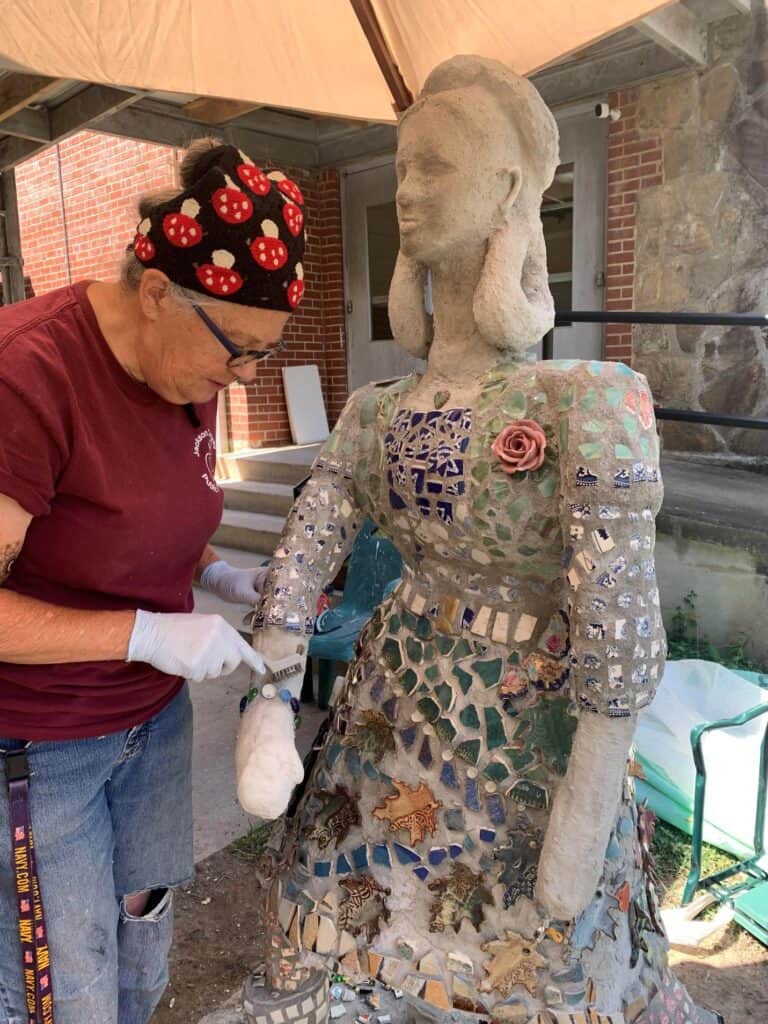 Local artist creating mosaic sculpture of a woman outdoors.