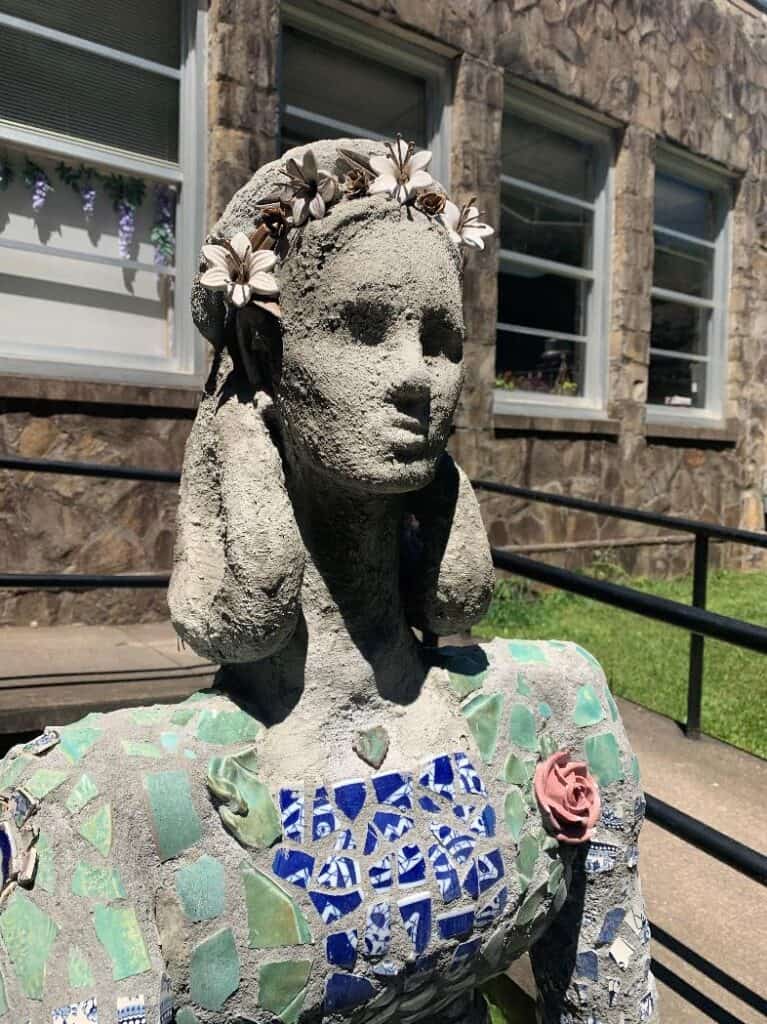 Bennett has named her sculpture “Helen Agnes,” after her mother and her aunt. She used carefully selected porcelain ornaments, gifted seashells, ornate china plates, salvaged tiles, and many fragments of past Cowee School pottery creations to create the colorful outfit that decorates the sculpture. Bennett’s favorite additions to the decoration of her sculpture are the unique leaves that travel down the dress.