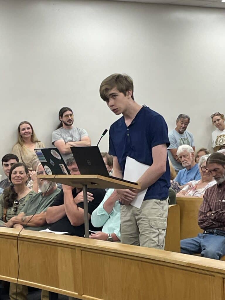 Alex Haiss, a rising junior at UNC-Chapel Hill, who grew up in Macon and Swain counties, presented a petition with 292 signatures that he and Western Carolina University student Garrett McCarson had circulated. The petition read, “We urge you to stop, think, and consult with experts before making any irreversible changes to our floodplain ordinance.”