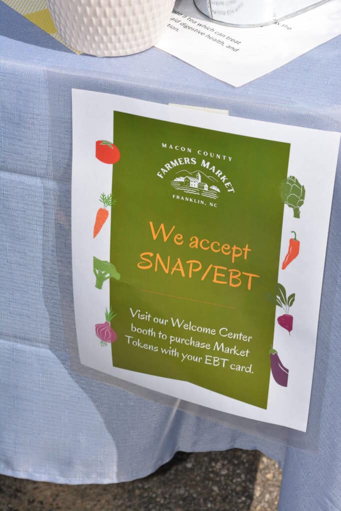 First of all, Supplemental Nutrition Assistance Program (SNAP) Electronic Benefits Transfer (EBT) payments are accepted at the Macon County Farmers Market. Instructions are provided on the website. Plus, because of a generous grant from the Community Foundation of Western North Carolina, the Macon County Farmers Market will double any SNAP/EBT dollars spent at exhibitor booths. This program is aptly called Double Snap.