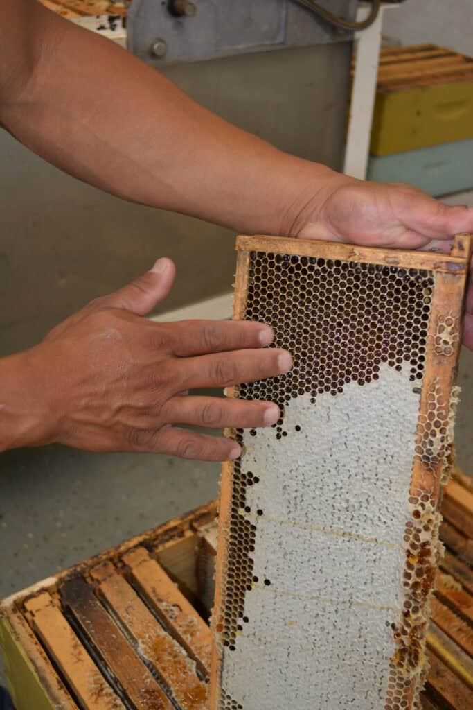 “We have to pull the trays (supers) and clean the wax off, then drain the honey, using a machine and cheesecloth,” said Hernandez.