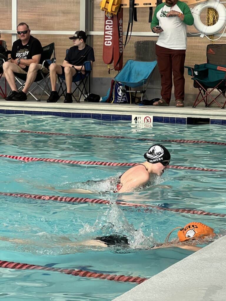 Swimmer competing in a swimming race at a local pool.