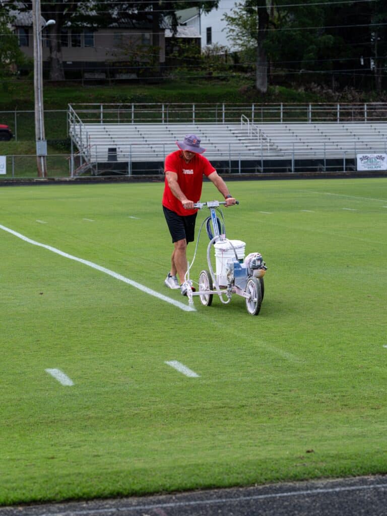 When October arrives, fall sports are in full swing and mowing is decreased to once or twice a week. Emphasis is placed on painting, and preparing the field for games while restoring the field afterwards. Painting the field on a Friday before a football game takes six hours to complete. Line painting and number painting are executed by a walk-behind machine. Other parts of the field are accomplished by hand, like the Franklin emblem located on the 50-yard line.