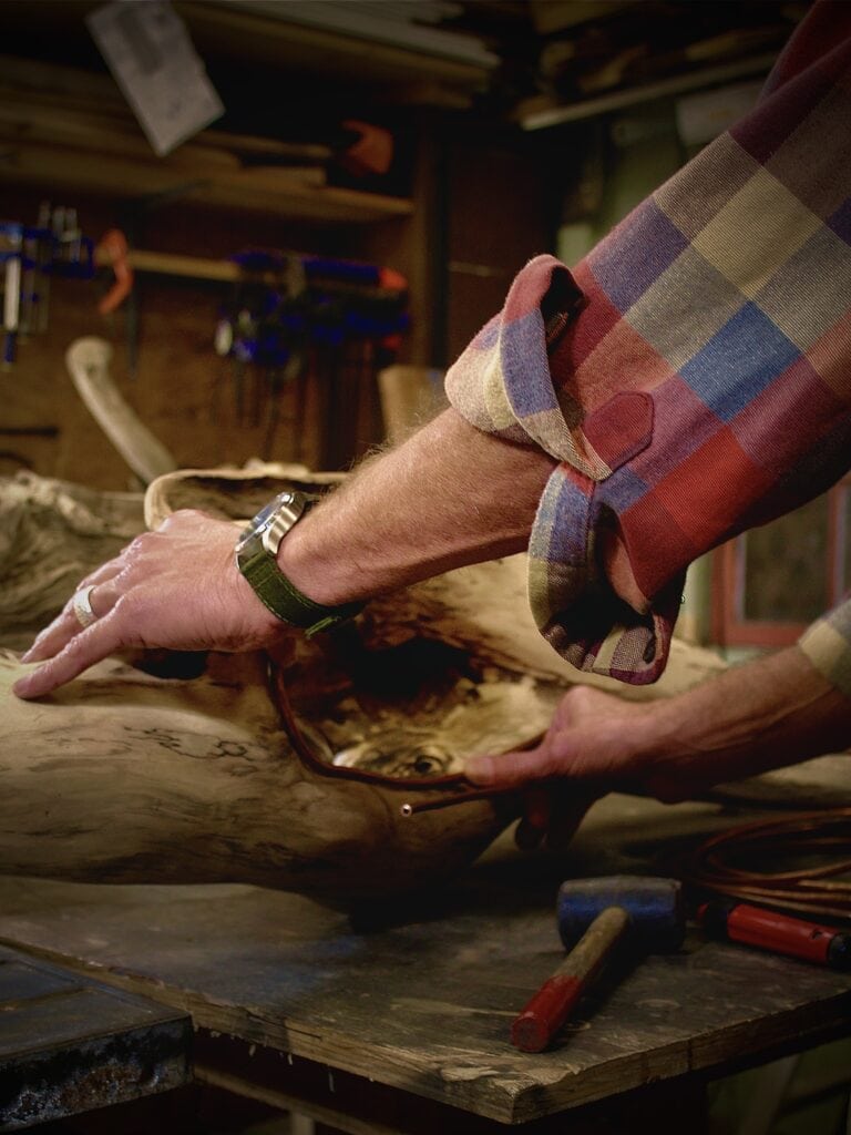 After finding suitable wood, Selby lets the pieces sit in his shop to cure and dry, sometimes for as long as six months to a year. After the root cures, Selby begins cleaning and sanding the wood without removing any natural curvature or character.