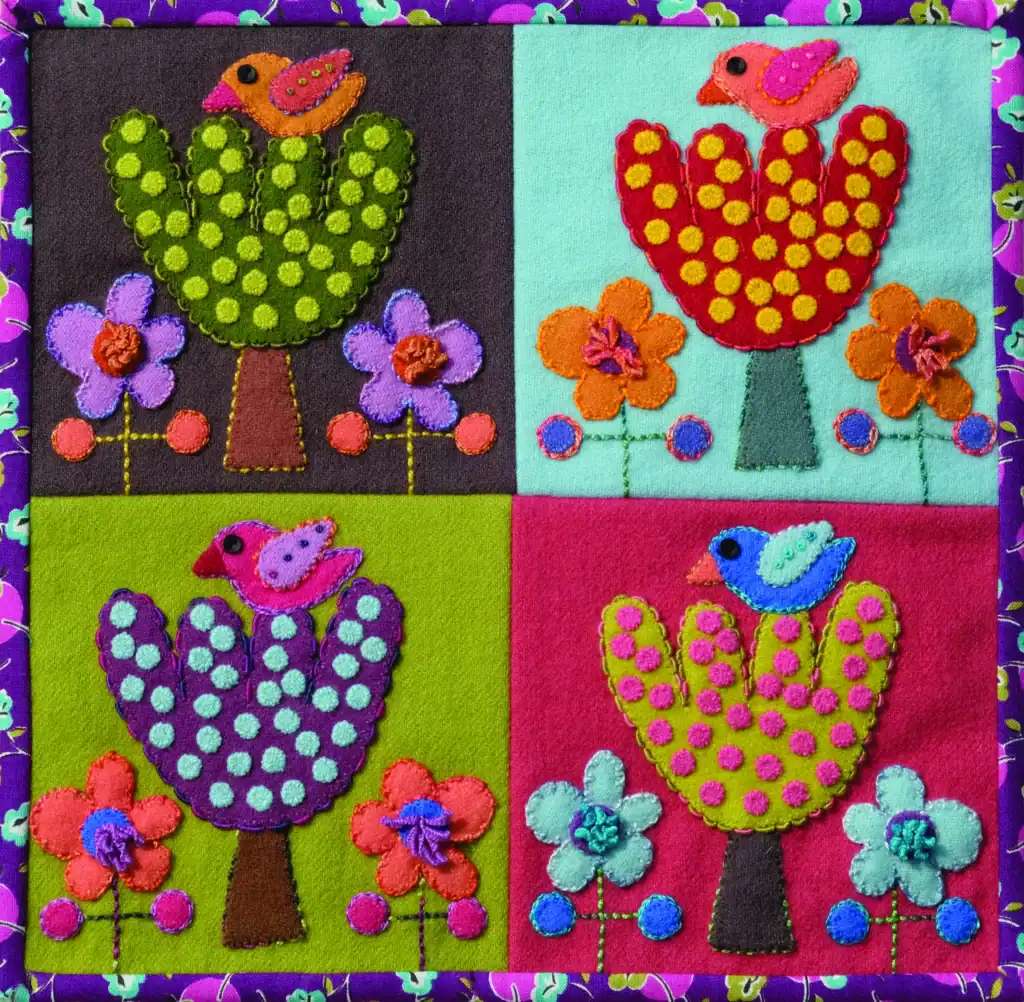 “Growing up in a family of ‘needle-women,’ watching them sew, quilt and knit, I made my first quilt when I was 8,” Rybicki shared. “That 9-Patch, with my grandmother’s help, turned into years of handwork enjoyment, both knitting and quilting. During COVID, Sue Spargo’s wool applique intrigued me, and I started experimenting with different embroidery stitches on wool. I like to embellish wool applique kits starting with tweaking the design and invisibly whipping down the pieces. Then the fun begins doing my own style of embellished embroidery stitching. It takes me months sometimes to complete a piece, but they all hang in my studio where I can enjoy them as I work on other things.”