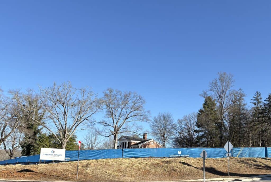 The historic columned house, across Wayah Street from Franklin High School, situated on what is referred to as the Higdon Property because of its original owners, is currently filled with construction activity. However, nothing at this time is being built or renovated on the Higdon Property for school use.