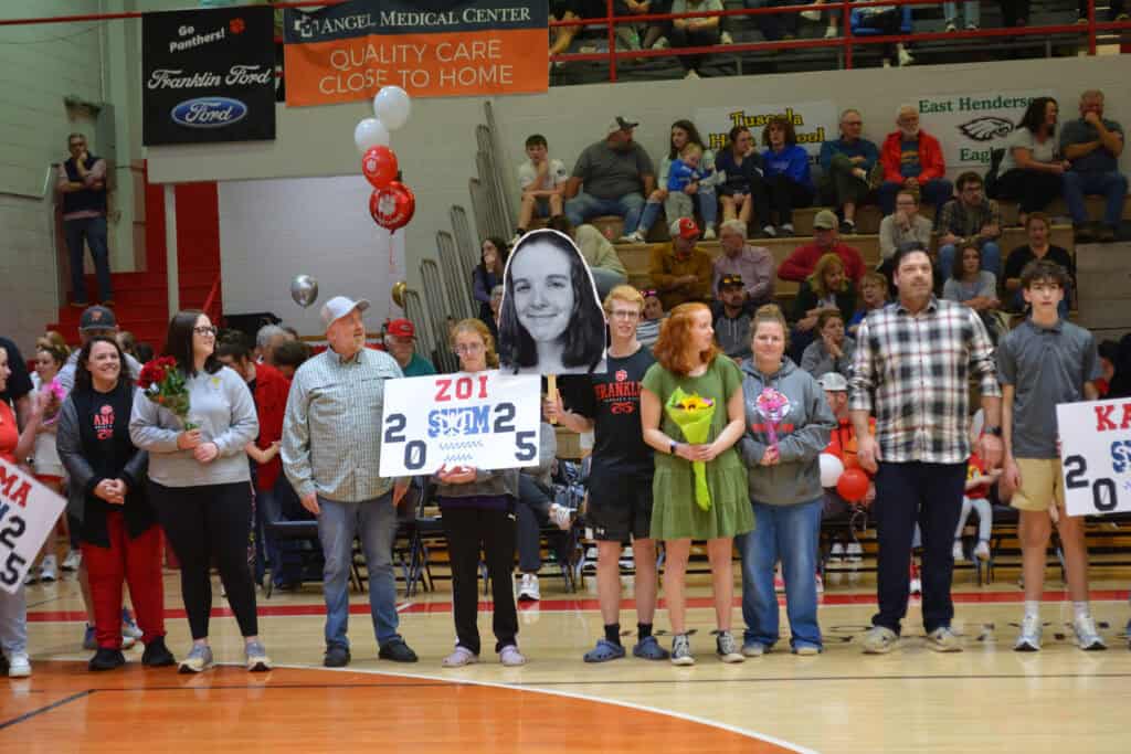 During a break between the Feb. 3 men’s and women’s Franklin High School basketball games, senior athletes from all winter sports – as well as cheerleaders – were recognized on the court during Senior Night.