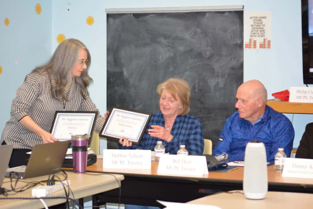 The three trustees who offered to serve on a nominating committee to replace outgoing trustees are Catlin, Gaston, and Debbie Franken. Trustee seats replaced in the near future will be for outgoing trustees Bill Dyar and Debbie Tallent, who are rotating off the board after serving two, three-year terms. Branch Librarian Abby Hardison presented Dyar and Tallent with certificates that read: “In recognition and appreciation for your years of dedicated service and outstanding contributions as a member of the Macon County Library Board.”