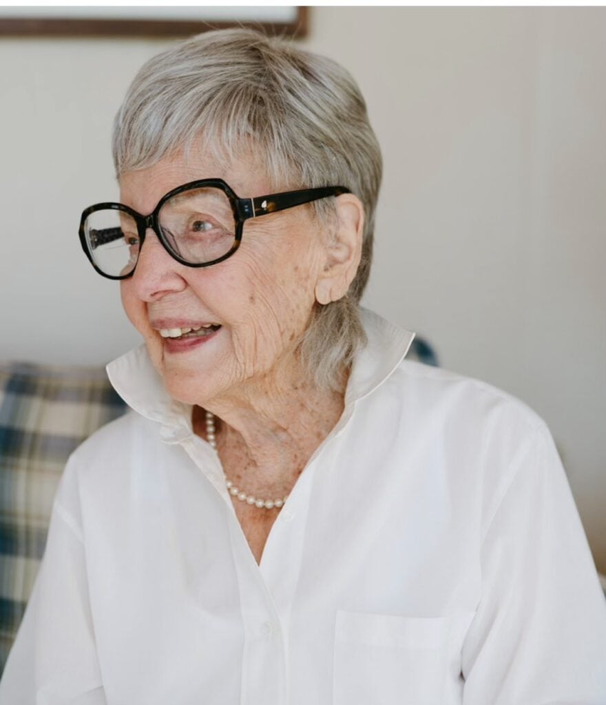 Elderly woman smiling, wearing glasses, symbolizing hope and faith in perseverance.