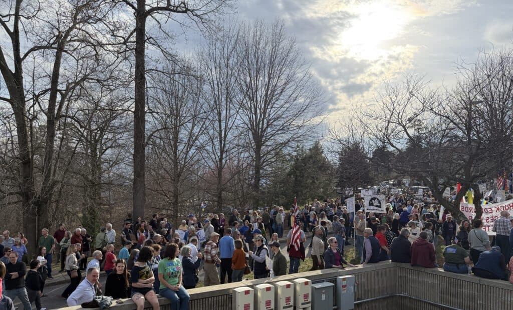 Most members of the public were turned away due to the limited space of 360 seats in Asheville’s Ferguson Hall, where the town hall was held. Well over 1,000 people were waiting in line, with more holding a protest in an impromptu town square set up outside the auditorium, as the meeting with Edwards began.