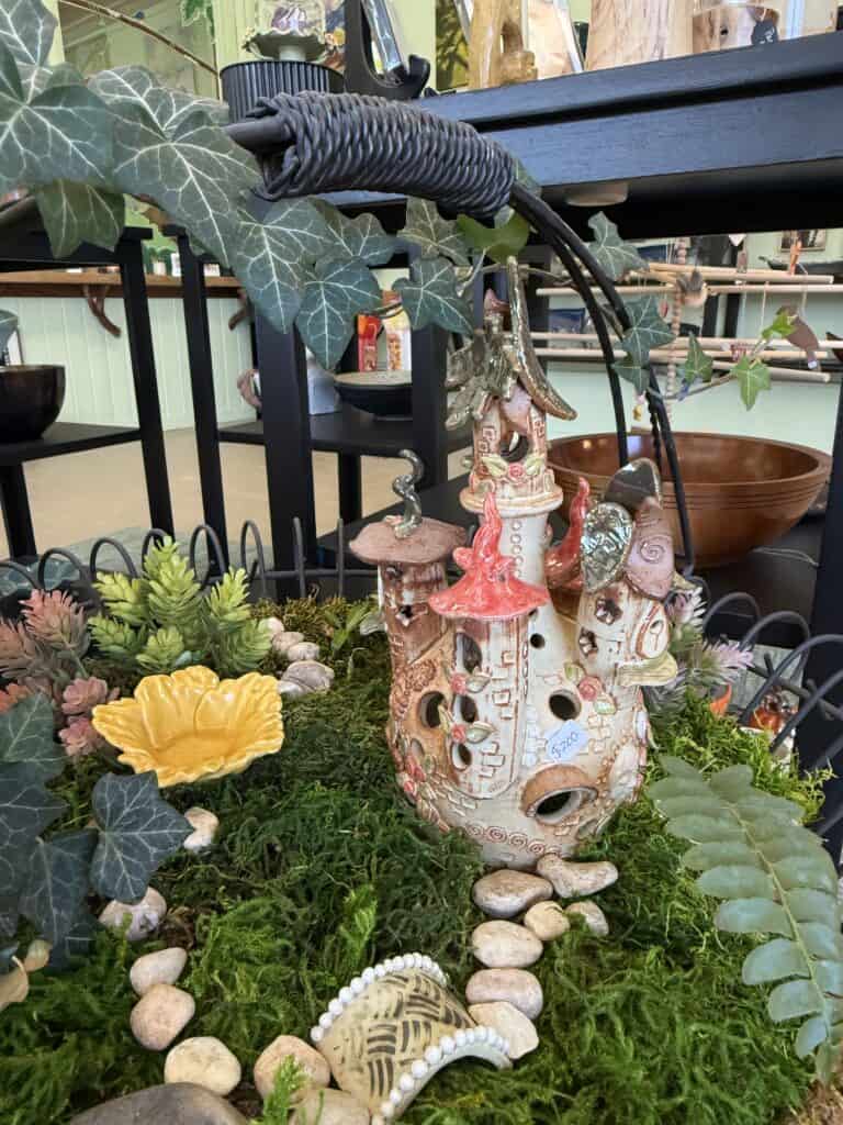 Taylor explained that they had a sudden opportunity in early 2024, when a lease became available, to convert a storage space for law enforcement transport on Main Street into a whimsical workspace where dragons, owls, teacups, castles, and lanterns – made of clay and then fired – come alive under their skilled hands.
