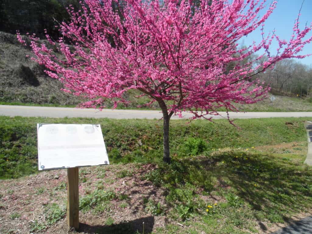 Cowee School building surrounded by trees and blooming flowers in spring.