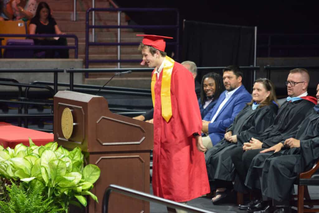 NATHAN McCALLISTER offers encouraging words to the Class of 2025. Others who spoke were Alexa Morales-Montelongo and Graham Caldwell.