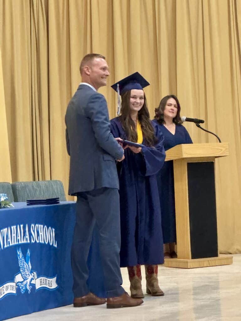 SCHOOL SUPERINTENDENT Josh Lynch presents a diploma to Nantahala High School senior Willow Manning.