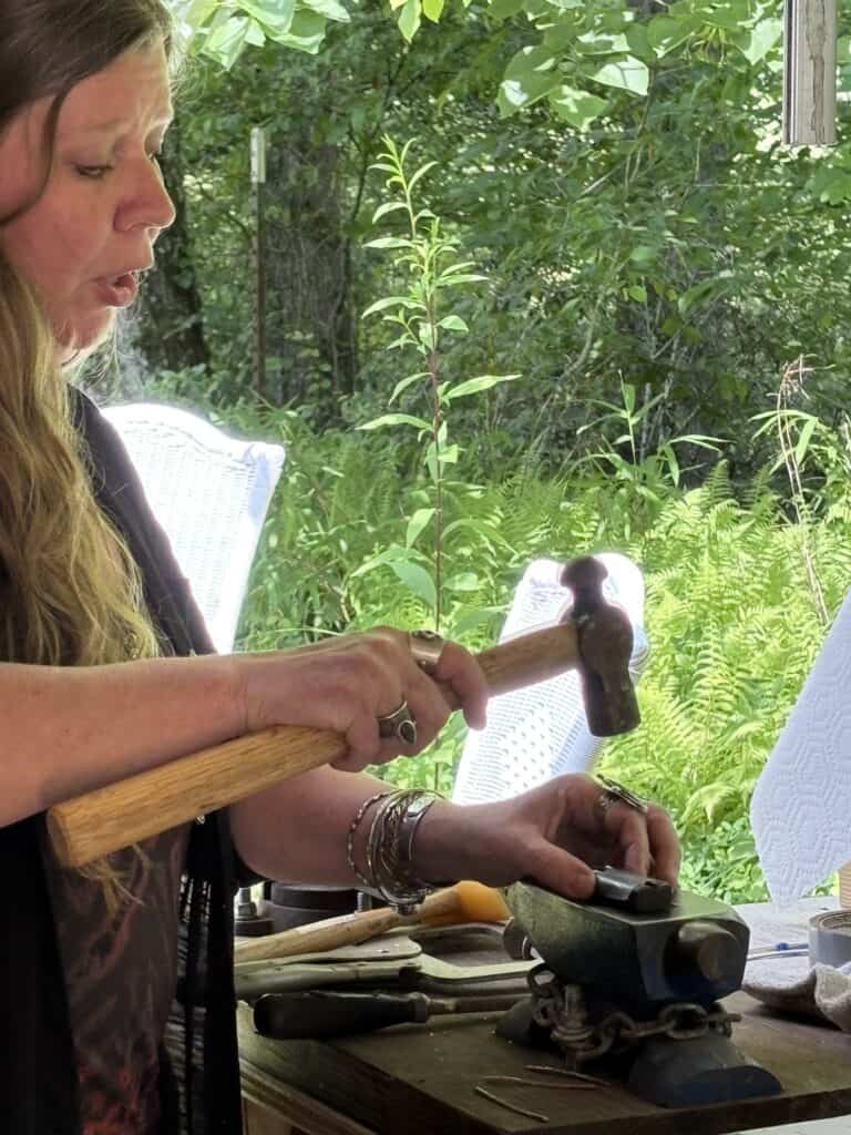 Tucked into seven acres of Otto’s woodland lies a studio full of tools and metals. An artist enters the workshop, decides what she wants to create, and begins the process of cutting, stamping, bending, quenching, and more. Soon, the first glimpses of her design start to form. She continues the process of shaping the metal and finally, the idea comes to life. This creative process is how metalsmith Shannon Noelke transforms metal into jewelry.