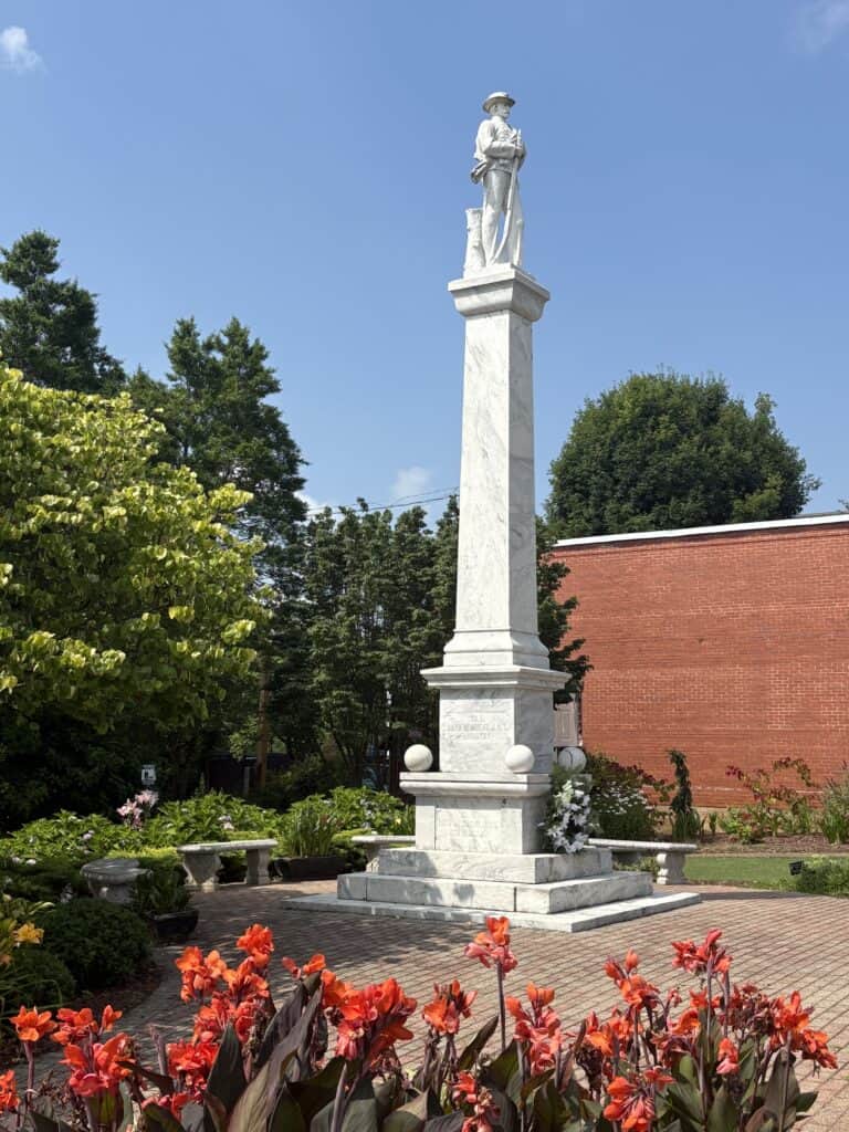 Commemorative Landscapes, an online source that offers information on the state’s monuments, describes the monument this way: “Three, wide-tiered slabs form the base of a 25-foot high, three-tiered square plinth. The four corners of the lower plinth section are accented with small spheres, representative of cannon balls. The plinth is topped with a six-foot tall Confederate soldier who stands, holding the barrel of his musket with two hands. Seven companies of Confederate soldiers formed in Macon County are memorialized on the monument. Company H, Sixteenth North Carolina Regiment, the first company formed, was honored with their inscription placed directly above the primary inscription. The three remaining sides of the monument display inscriptions to three cavalry and three infantry companies.”