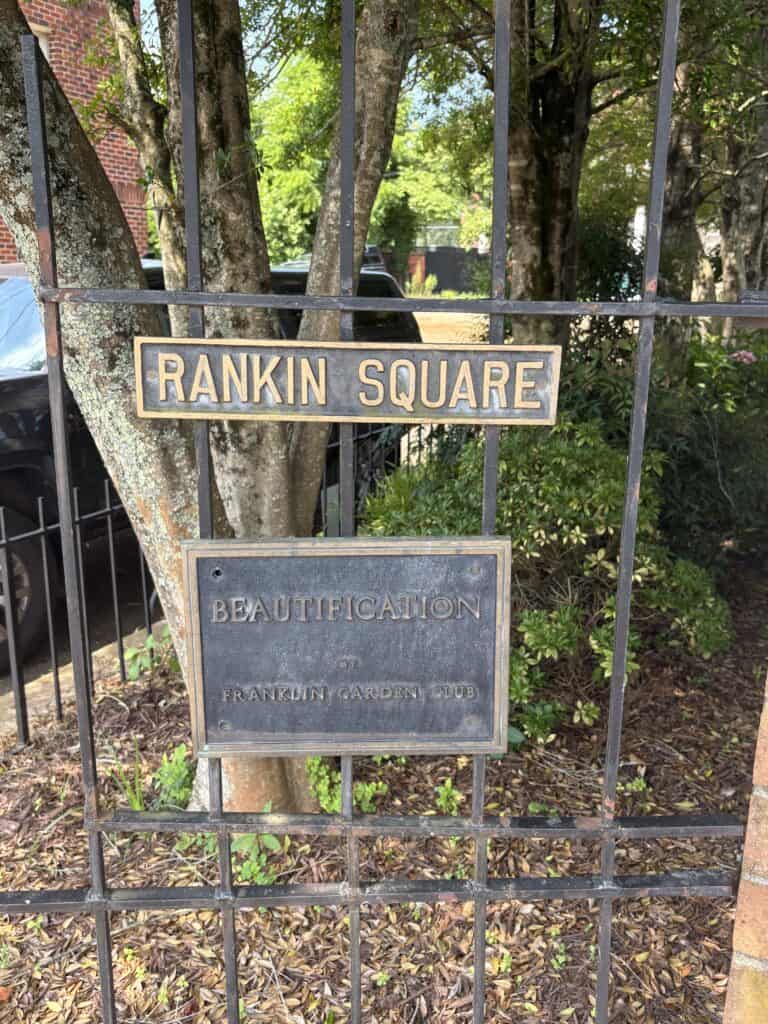 A PLAQUE on the fence on Rankin Square honors the Franklin Garden Club for its ongoing beautification efforts.