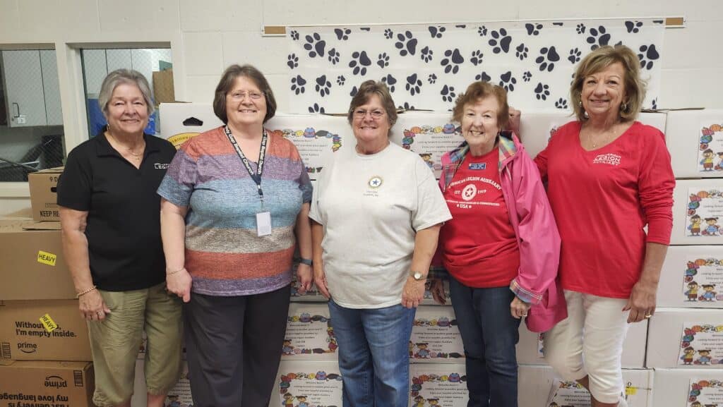 PICTURED ARE, from left, Auxiliary member Rosanne Albiston; secretary/bookkeeper of East Franklin Elementary Rita Hall; Auxiliary president Cathy Byrd; Auxiliary members Alicia Evans and Genita Selby with the 33 boxes of school supplies they collected and delivered to East Franklin Elementary School.