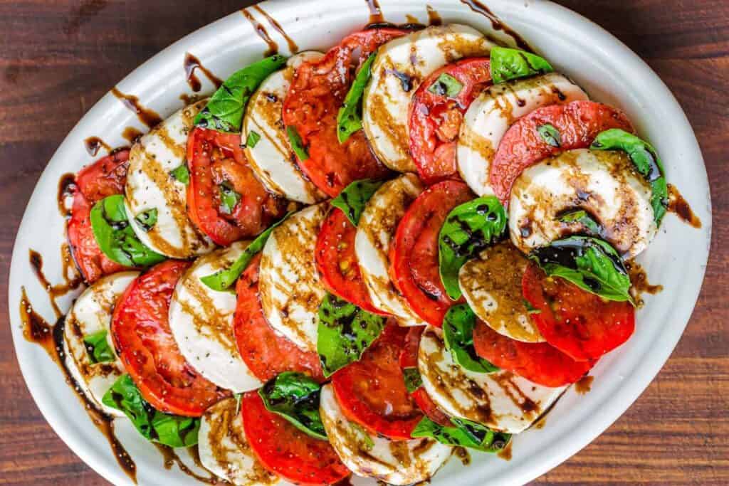 Caprese salad is an Italian salad prepared with sliced fresh mozzarella, tomatoes, and sweet basil and seasoned with salt and olive oil. It is usually arranged on a plate in restaurant practice. The addition of peaches adds a sweet component to the savory dish.